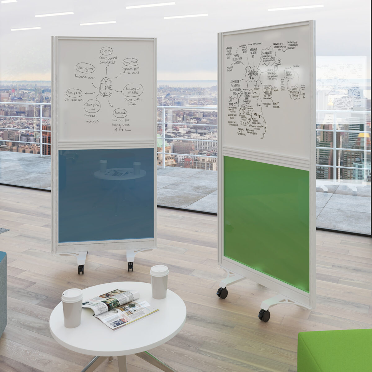 Aluminium frame floor screens are free-standing mobile units, available fully upholstered or half-upholstered with a writable whiteboard top surface that promotes collaboration and facilitate idea sharing. This mobile screen adds seamless, flexible function to the office environment, with a variety of sizes that can be easily configured to serve as temporary workspace dividers, or used for sharing information in presentations or meeting settings.