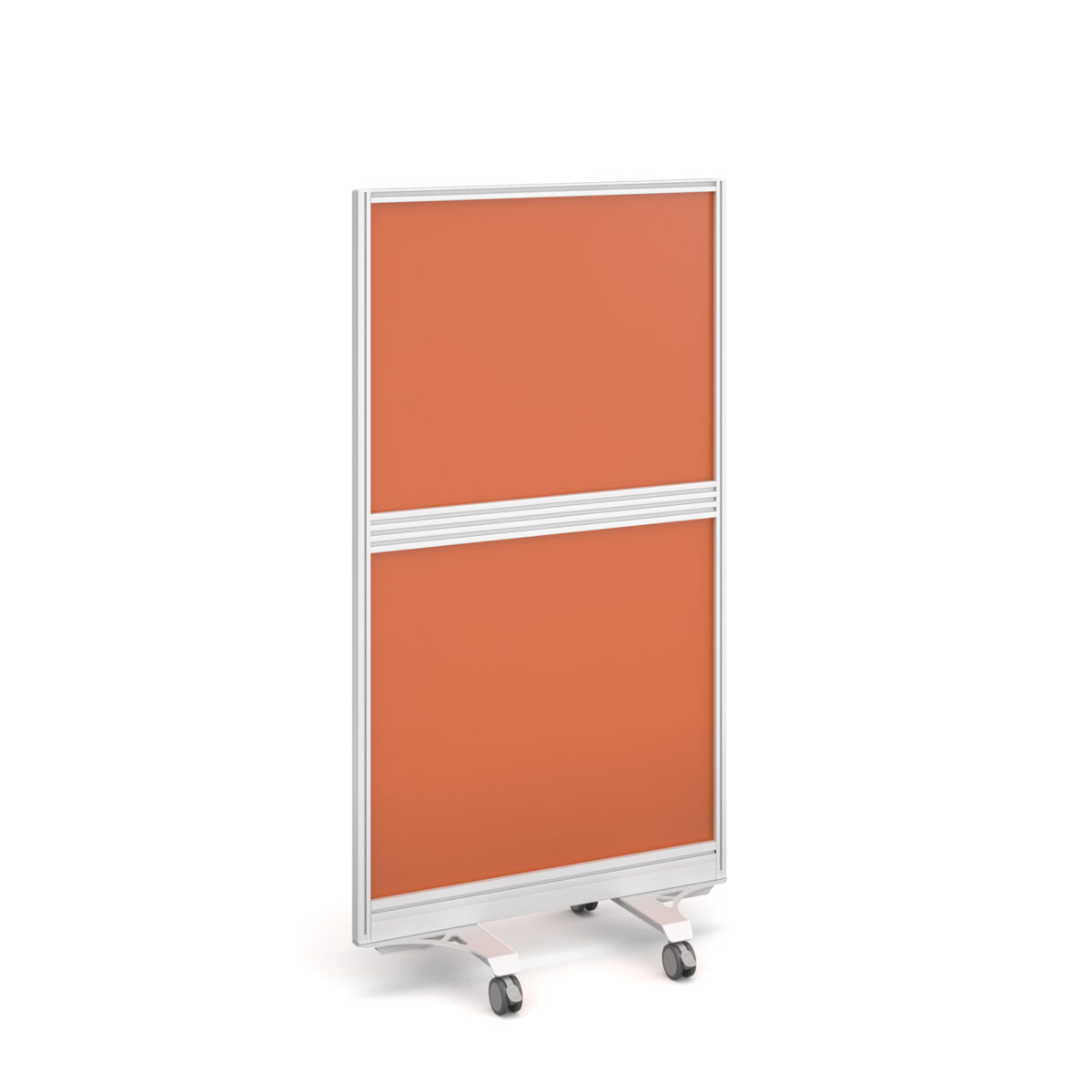 - White frame glazed mobile screen supplied with feet and available in 1500mm or 1800mm high
