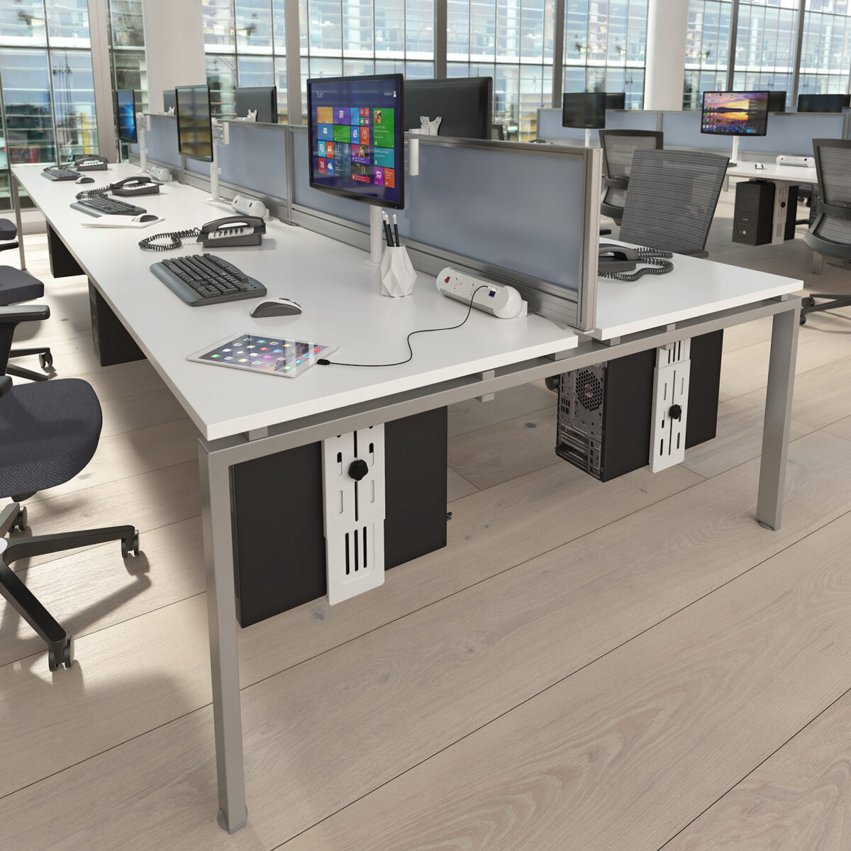 Our extremely durable Halo 4-sided CPU holder mounts beneath the work surface to elevate the computer off the floor and protecting it from floor dirt, dust, and accidental kicking or moving, and provide added floor and desktop space. There is convenient access to ports and cables, quick and easy installation and removal, and an under-desk track mount on a swivel that can complete a full rotation of 360 degrees