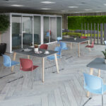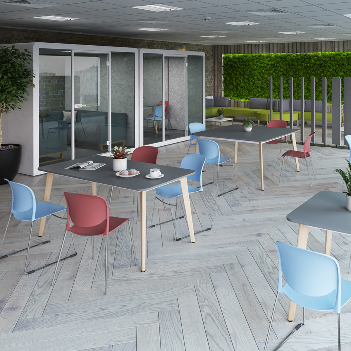 - Square poseur tables with curved edges and 25mm tops